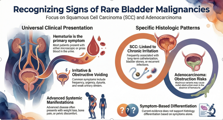 Squamous cell carcinoma (SCC) and adenocarcinoma of the bladder typically present with nonspecific lower urinary tract symptoms that overlap with other bladder cancer subtypes. Current evidence does not support symptom-based differentiation between these histologies. Definitive diagnosis relies on cystoscopic evaluation and histopathological confirmation, rather than clinical presentation alone.