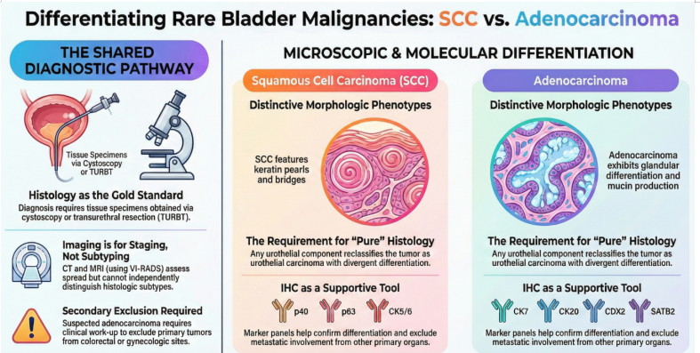 Squamous cell carcinoma (SCC) and adenocarcinoma of the bladder are both diagnosed through histopathological evaluation of tissue specimens obtained via cystoscopy or surgical resection. No imaging modalities or urine-based tests can independently distinguish these histologic subtypes. Differentiation relies on morphologic assessment, supported by clinical context and selected immunohistochemical (IHC) markers.