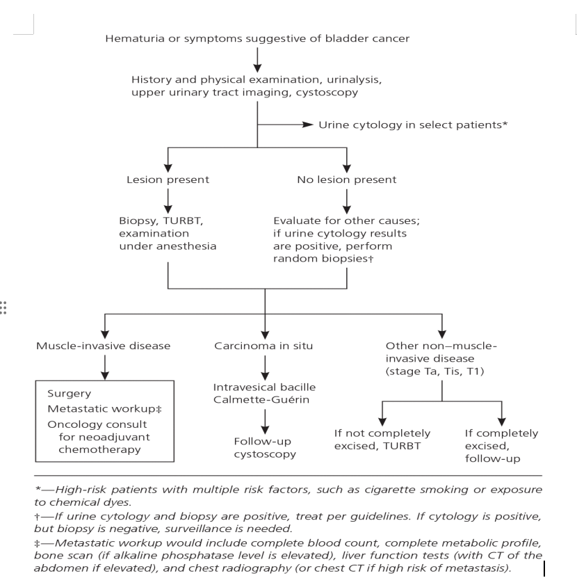 Cystoscopy with biopsy or transurethral resection of bladder tumor (TURBT) following evaluation of hematuria; histology remains the diagnostic gold standard for all bladder cancers [26].